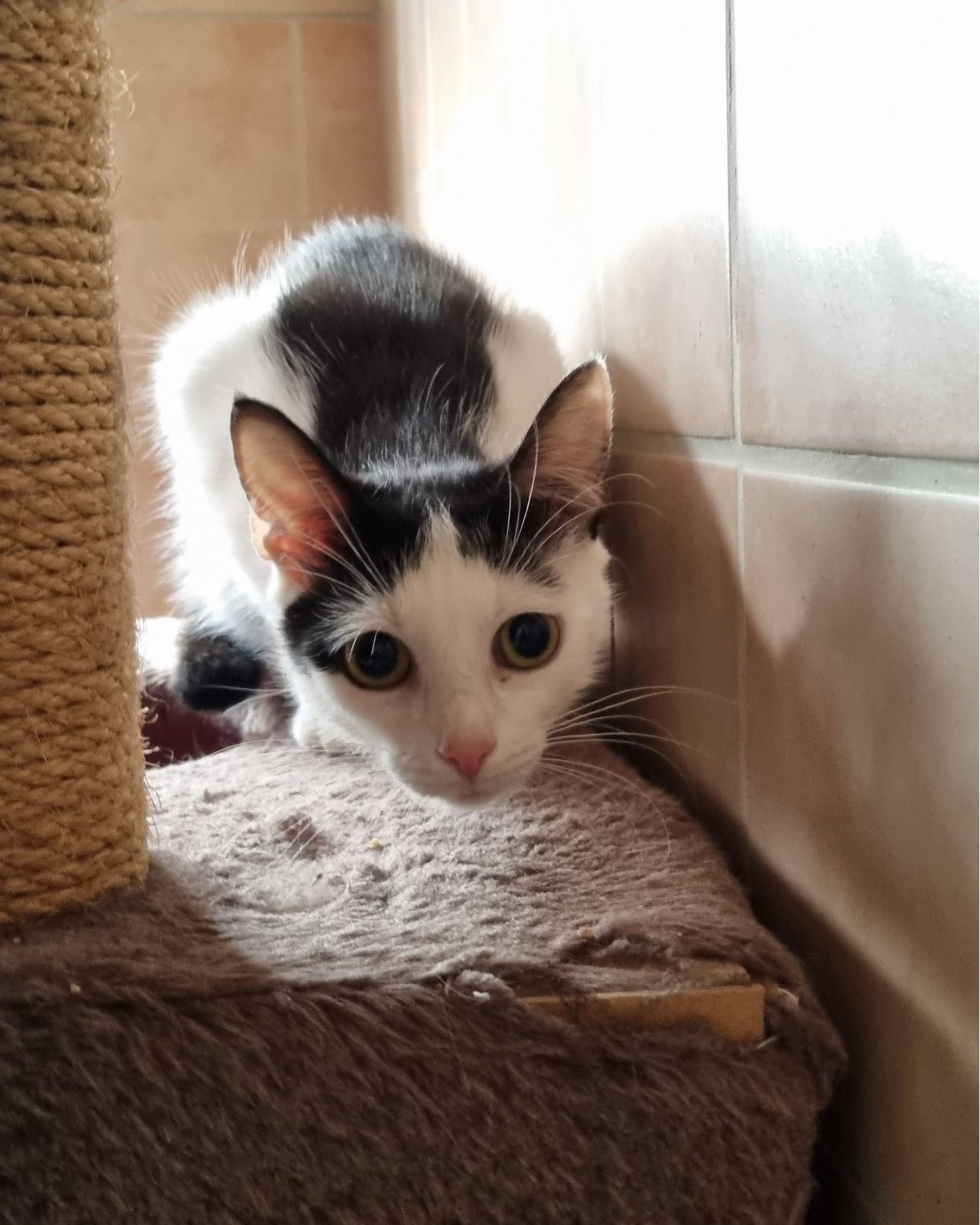 10/24 Unsere süße Maus Jenna ist ca. im Juni 2023 geboren und eine ganz zarte Mieze, die sich gerne zurückzieht und von ihrem Lieblingsplatz oben aufm Kratzbaum alles beobachtet.